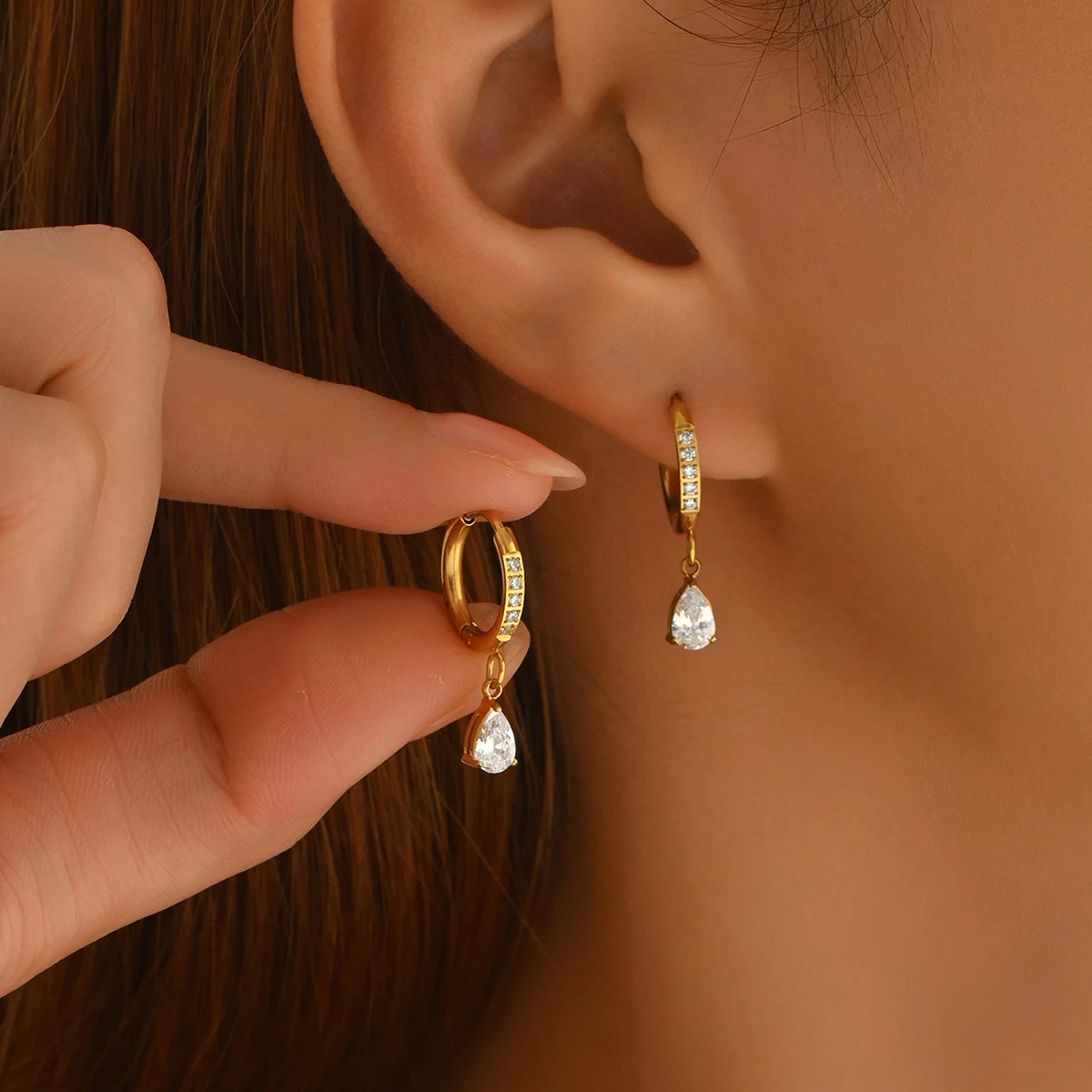 Realce o seu estilo com estes brincos pendentes em forma de gota, incrustados com diamantes artificiais brilhantes. Uma peça elegante, delicada e sofisticada, perfeita para mulheres que valorizam acessórios refinados e modernos.